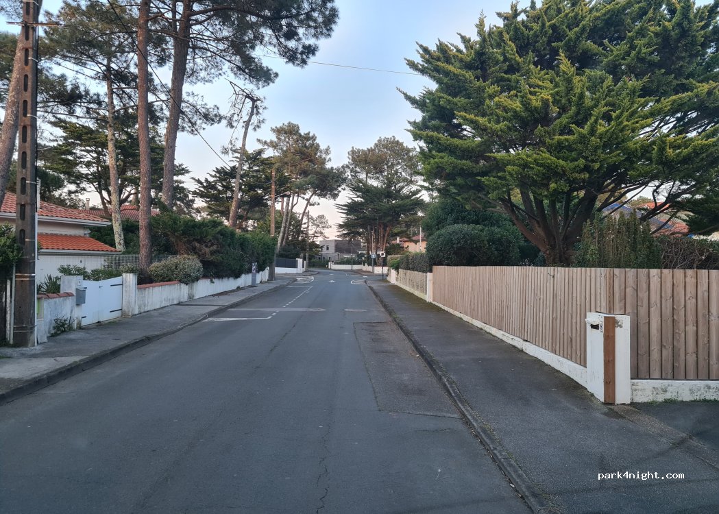 One-way street, there are no parking prohibition signs for vehicles over 1.9m. Paid parking from July 1st until September 15th during the day. Close to the beach.