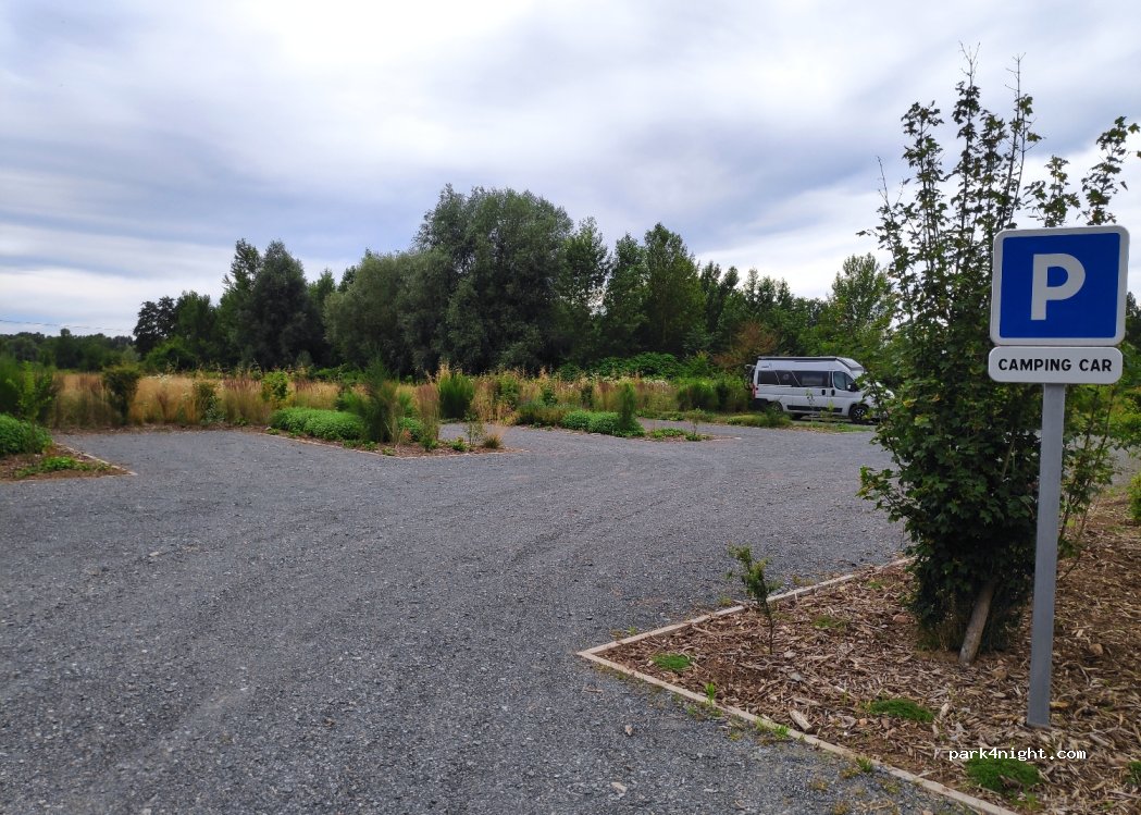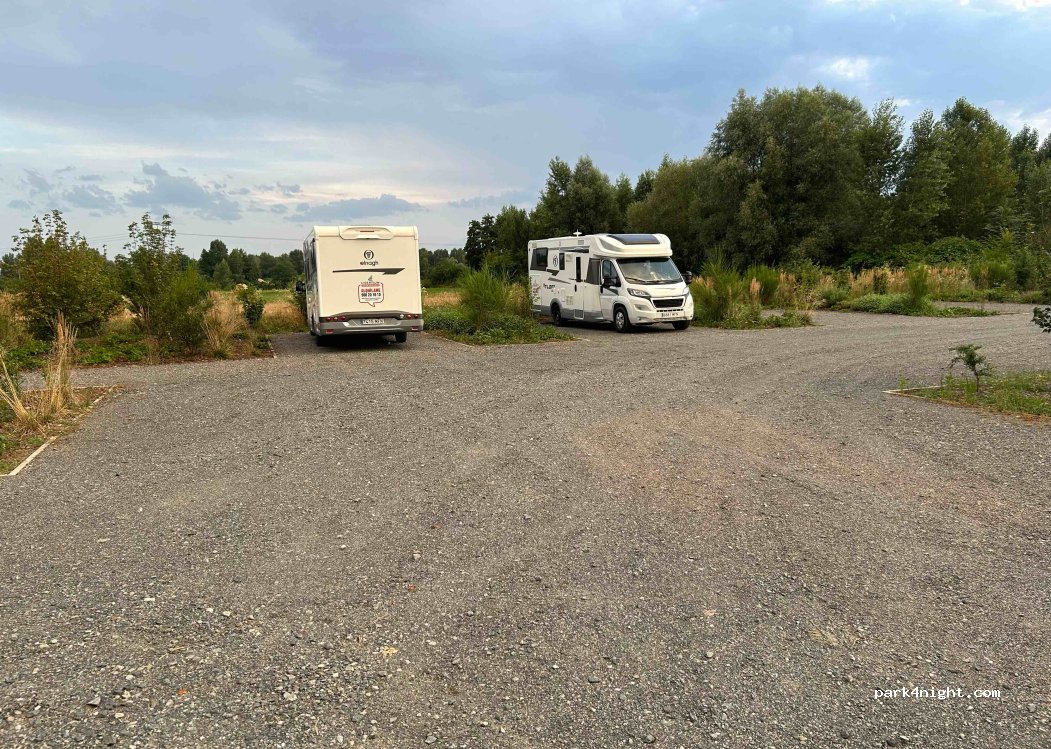 très belle aire sans service, mais calme. 5 emplacements délimités sur gravier. L'aire n'est pas indiquée en ville... il faut se rendre au stade puis suivre les panneaux parking sur le chemin en gravier à droite du stade. ensuite c'est la tranquillité. on peut faire le tour des étangs à pieds ou en vélo. on entend un peu le train au loin, mais c'est acceptable !