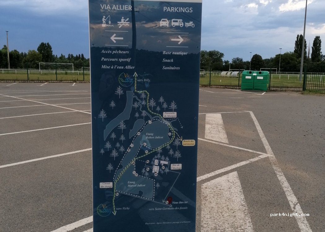 Excelente área junto ao Centro de Lazer de Saint-Germain-des-Fossés, com 5 vagas bem delimitadas. Passamos uma noite muito tranquila, em companhia de mais um RV. Como já comentado, o acesso mais fácil é indo até o campo de esportes e seguir à direita pelo caminho que rodeia o campo.