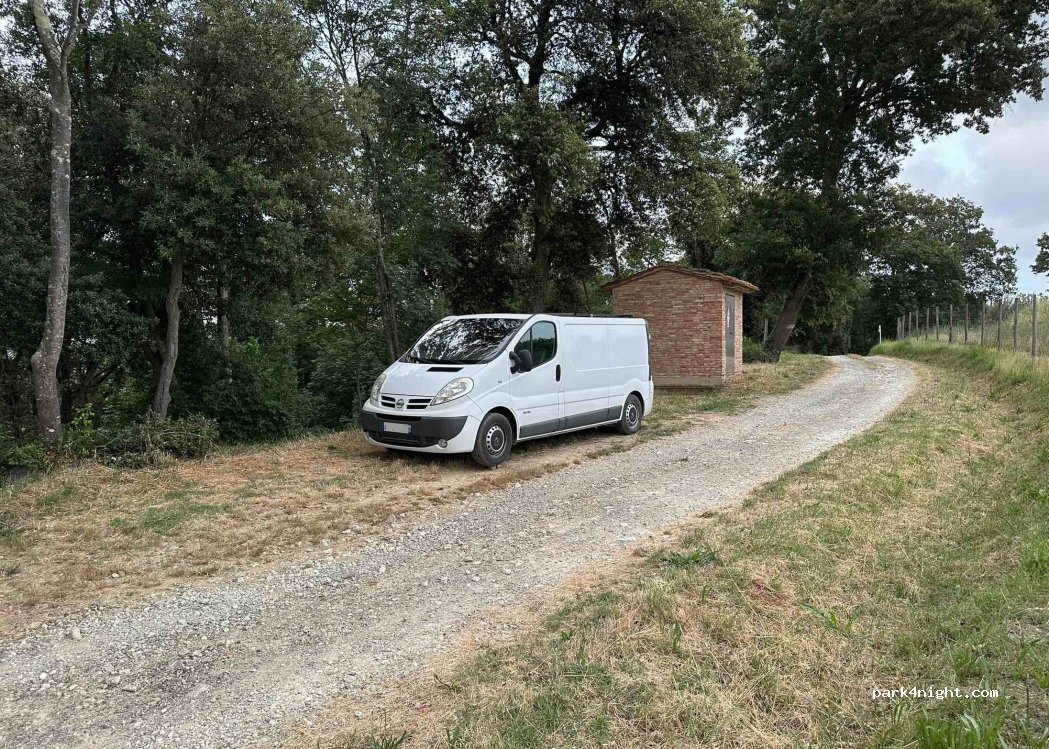 On the edge of a dead-end road, next to the vineyards, very quiet. There were people at the point before so we continued up here. We spent the night and only saw a few cyclists and a car passing by. No service, shaded place, almost flat. To get there, it's a stone path, I recommend it for small vans.