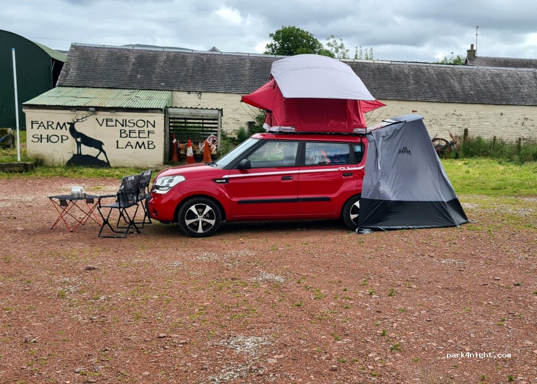 Einfacher aber sehr ruhiger Übernachtungsplatz mit einem traditionellen und urigem Farm Shop des Carmichael Clans.