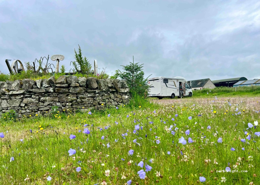 Geräumiger Platz für ca. 6 Wohnmobile bei einem Hofladen.