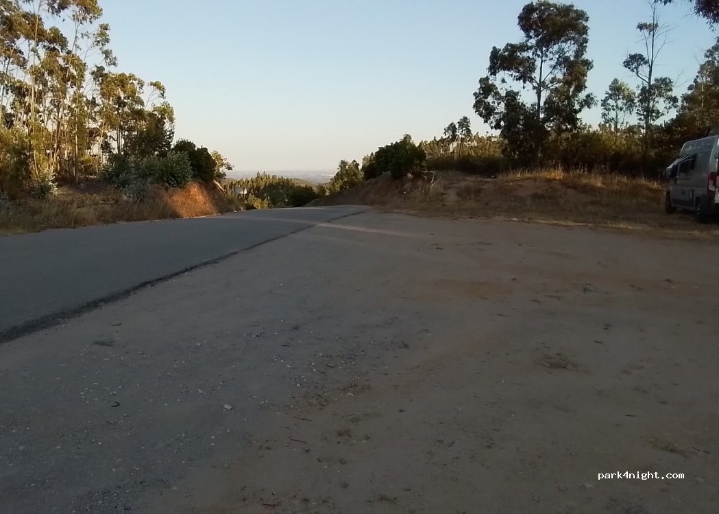 Grand parking au bord d’une route peu passagère, entouré d’eucalyptus