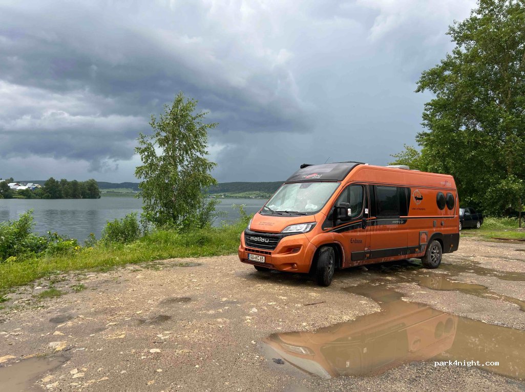 Platz zwischen Straße und See. Straße wenig befahren