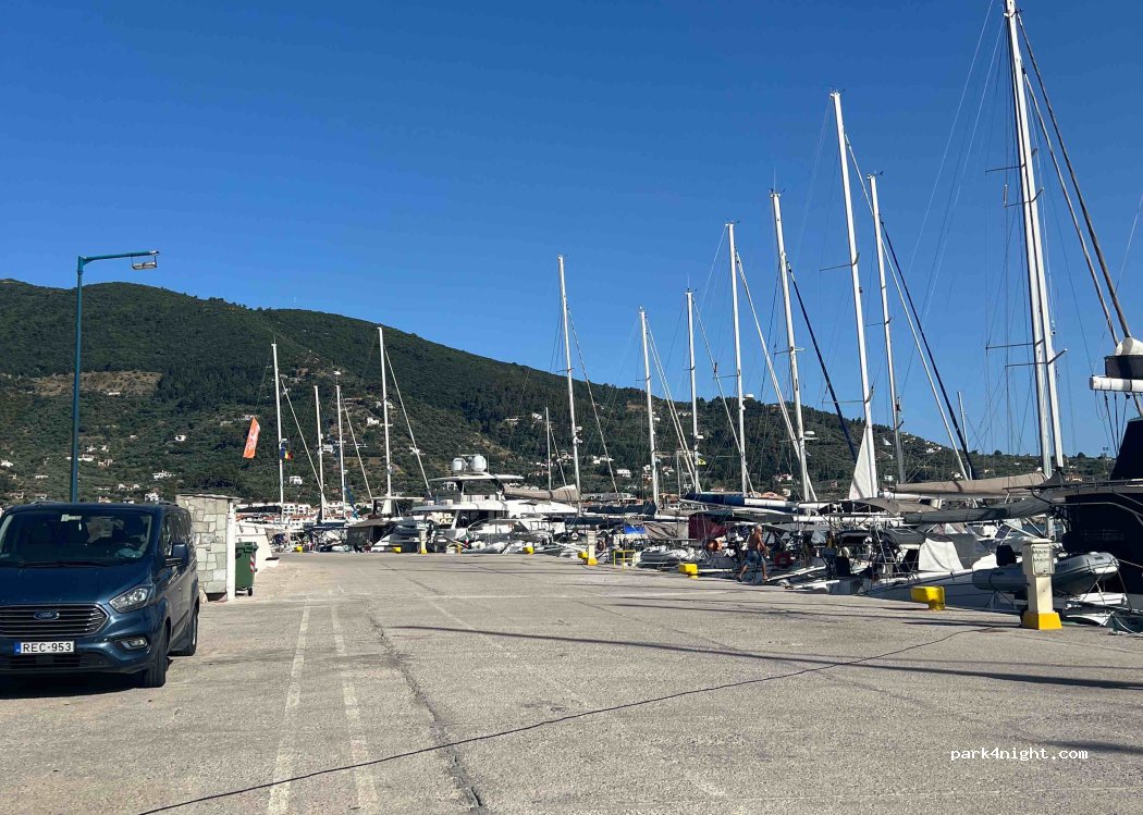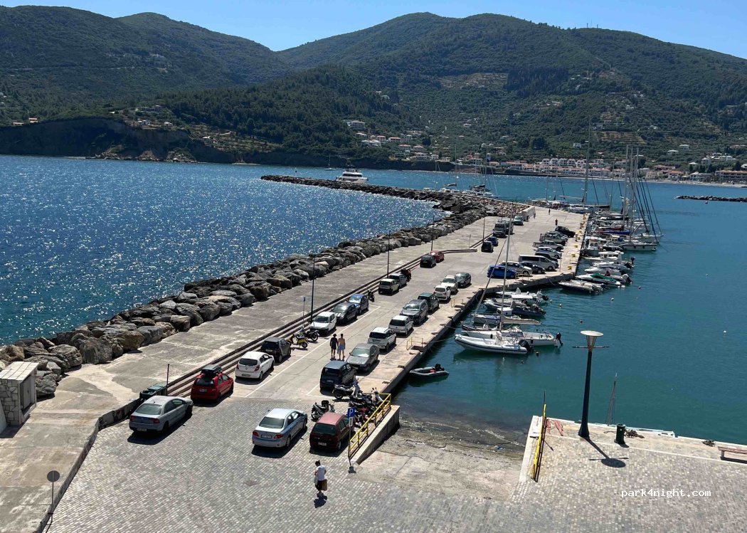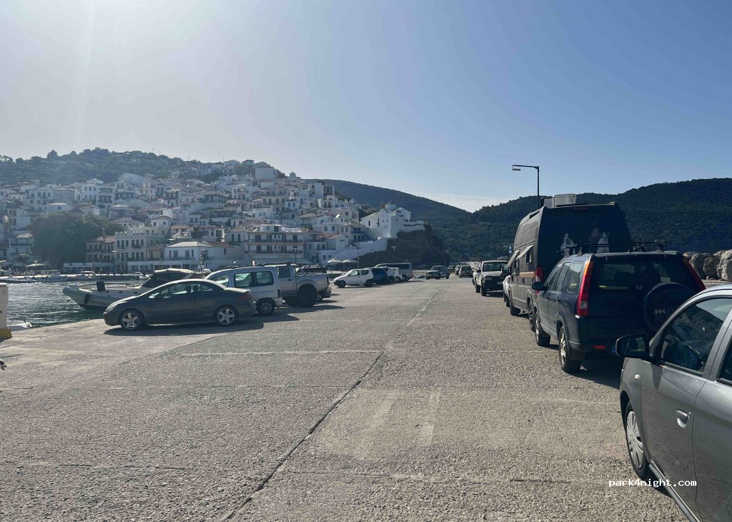 Nice harbor parking space directly in Skopelos with day and night restrictions (see picture). In the supermarket around the corner you can buy electricity and water chips and refuel directly at the harbor.