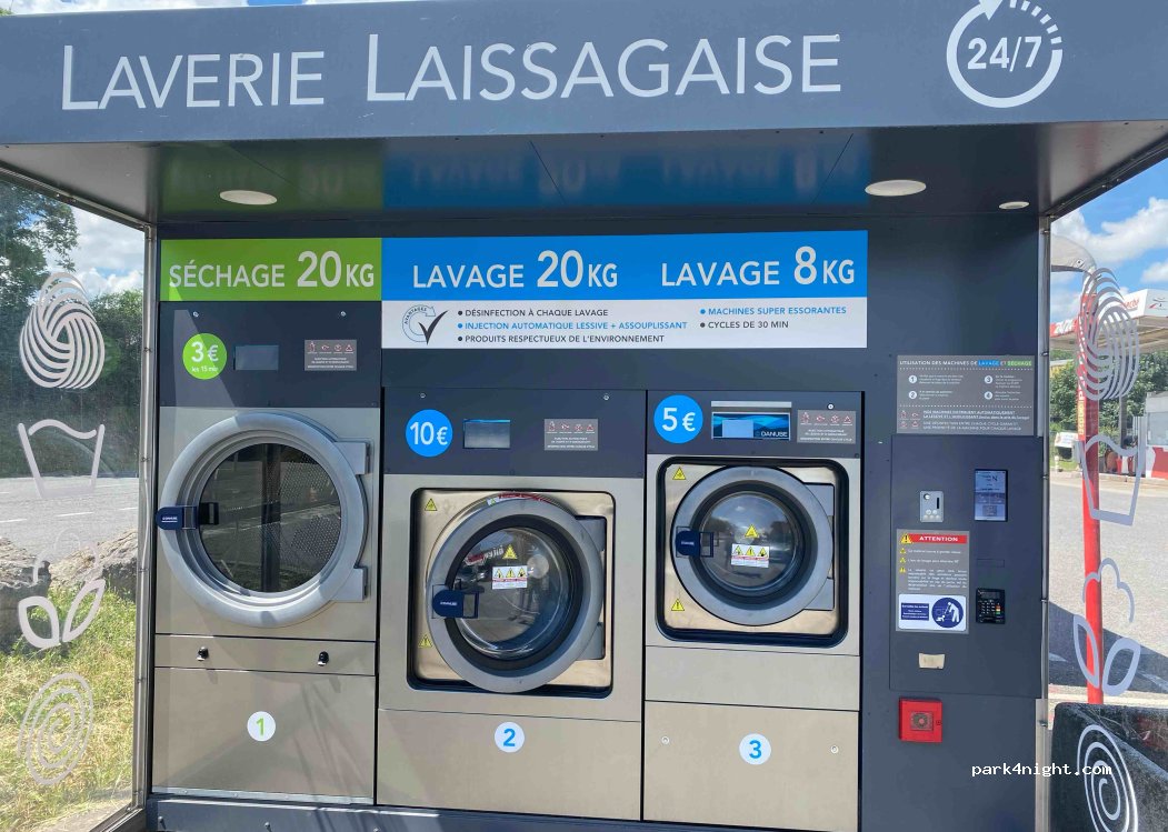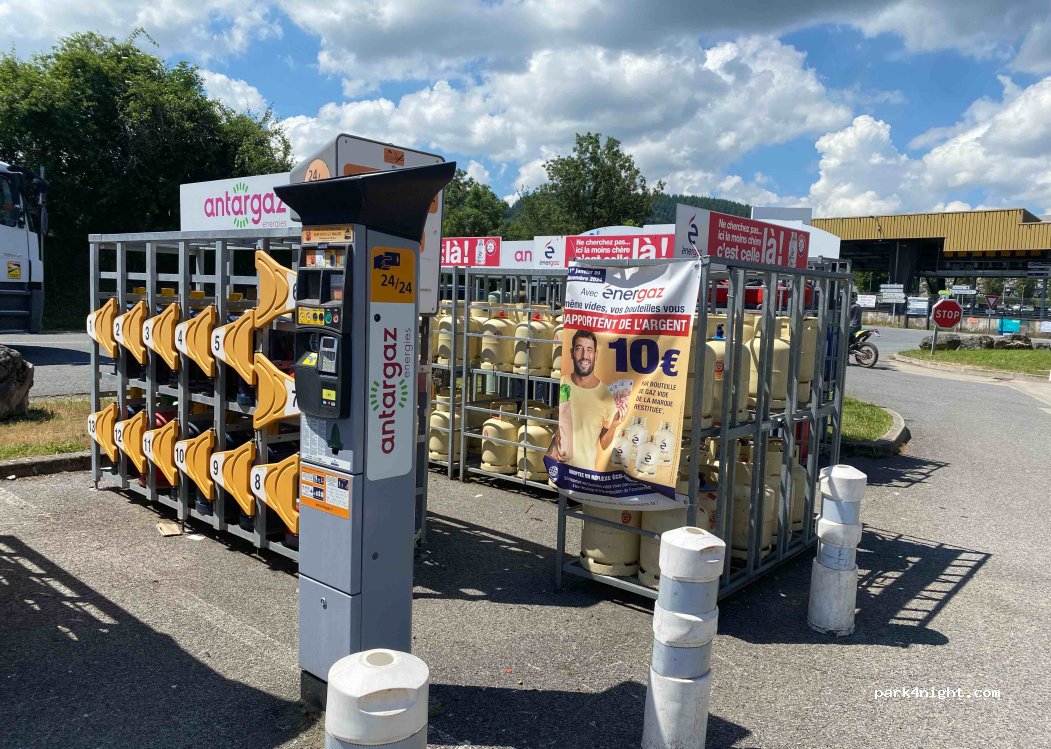 Intermarché petrol station with washing machines, dryers and 24/7 gas bottle exchange.