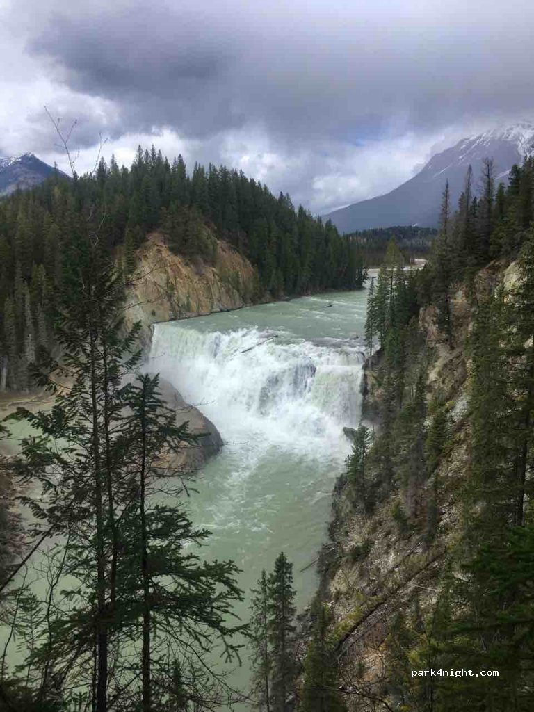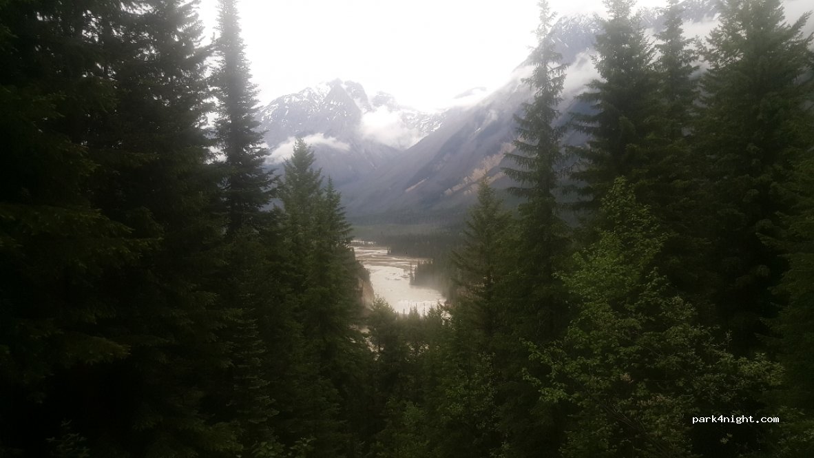 Nicht viel Platz (2), aber ein schöner Ort mit schöner Aussicht auf die Wapta Falls. Schmale und holprige Straße, ein Auto kann langsam passieren, aber die Wohnmobile werden nicht empfohlen.