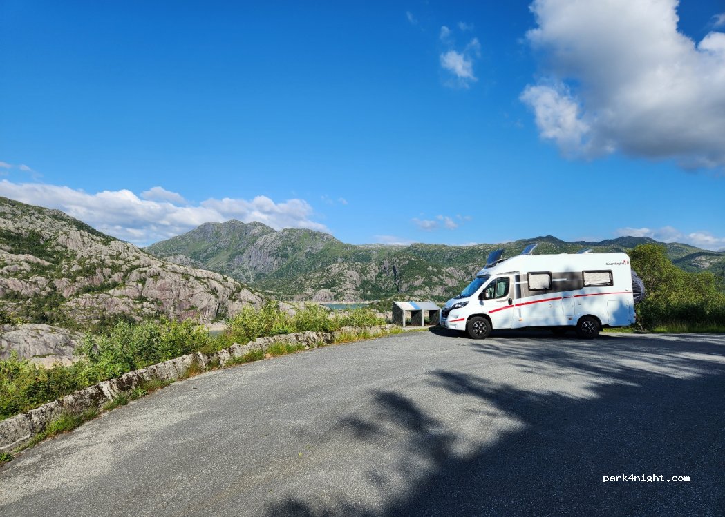 Grand espace pavé à côté de la route, avec une superbe vue sur le lac. La partie supérieure est assez plate. Le reste est en pente.