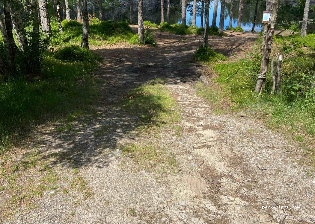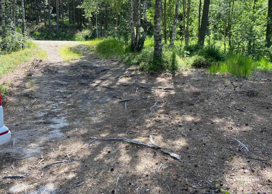 Place de parking de rêve pour campeurs Calli en forêt, inadaptée par temps de pluie car non goudronnée, l'accès est enraciné donc pas pour camping-cars, bateaux à moteur occasionnels, le lac est magnifique pour la baignade