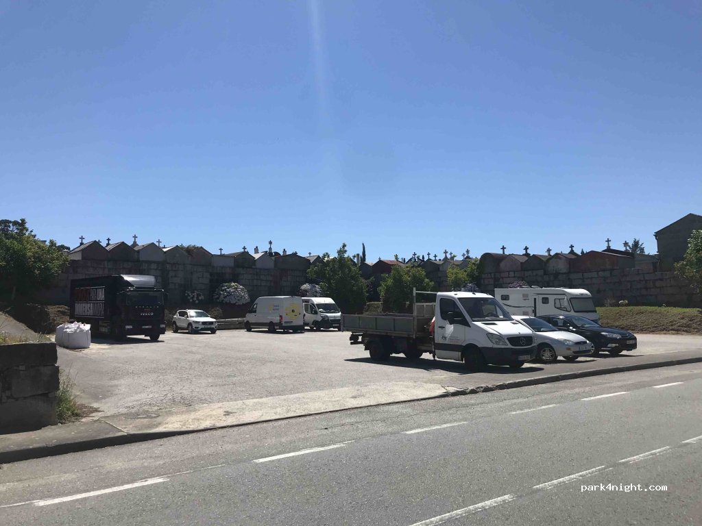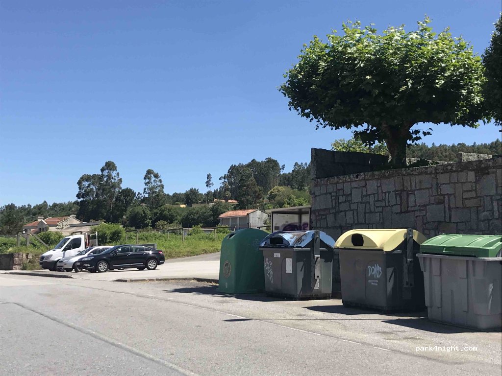Slightly inclined and paved parking lot next to the cemetery. There are containers. Camping items cannot be taken out. The Sanxenxo promenade is 1.5 km away.