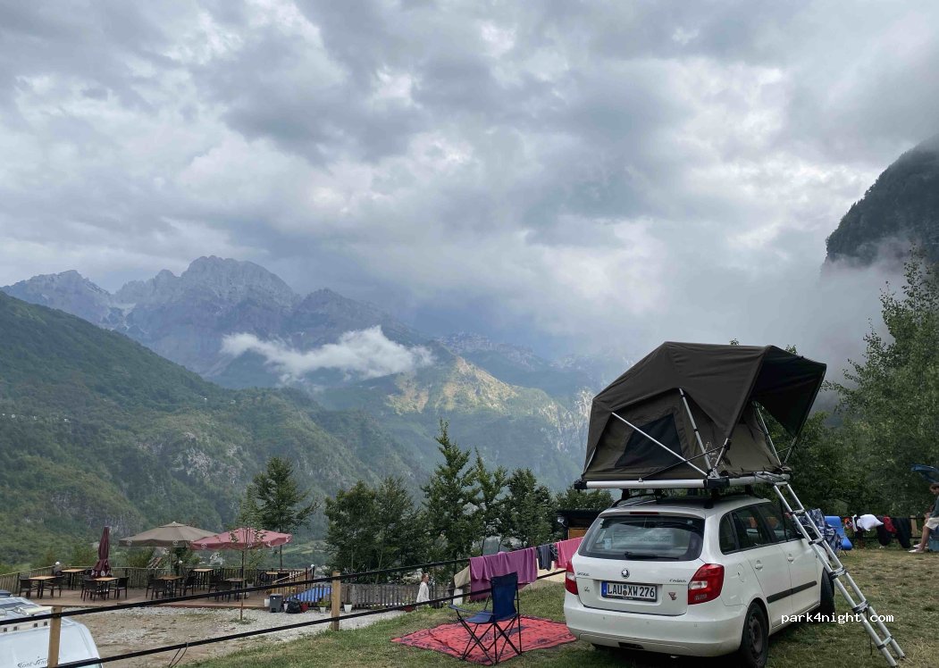 Sehr schöner Platz, mit einer tollen Aussicht runter ins Tal. Gut geeignet für Wohnmobile und Leute mit Zelten. Strom und gutes Trinkwasser gibt es an den meisten Plätzen. Runter nach Theth kann man in ca. 15 Minuten laufen, oder mit der ca. 100m entfernten Sip-Line. In ca. 2 Minuten. Im Tal unten gibt es auch einen bestens sortierten Supermarkt. Sehr hilfsbereiter Betreiber. Man kann auch an der netten Bar Frühstücken. Sanitäranlagen sind tiptop gepflegt. Warme Duschen.