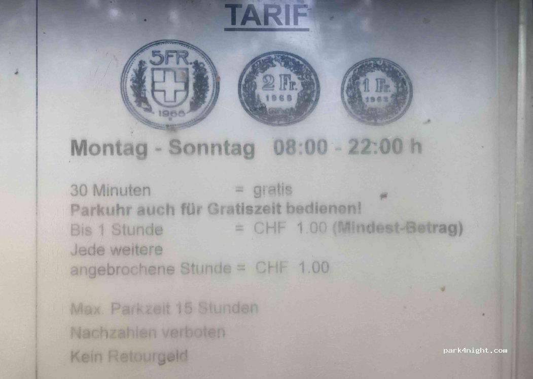 Le parking est agréable, terrain en pente douce, les arbres fournissent un peu d'ombre et le Greifensee n'est qu'à 2 minutes à pied, il y a aussi des toilettes publiques. On entend le bruit de la station d'épuration et les voitures dans la rue principale, mais la nuit, la circulation est limitée. Temps de stationnement maximum de 15 heures.