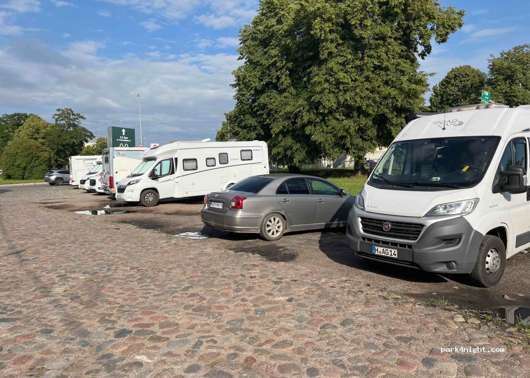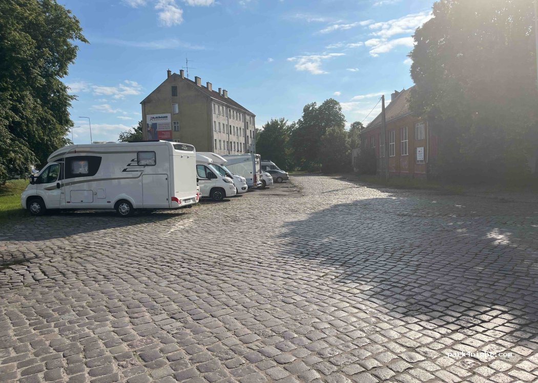 Einfacher Parkplatz nah am Zentrum. Auch für 6m geeignet. Direkt in unmittelbarer Nähe ist „Biedronka“ um Vorräte zu besorgen.