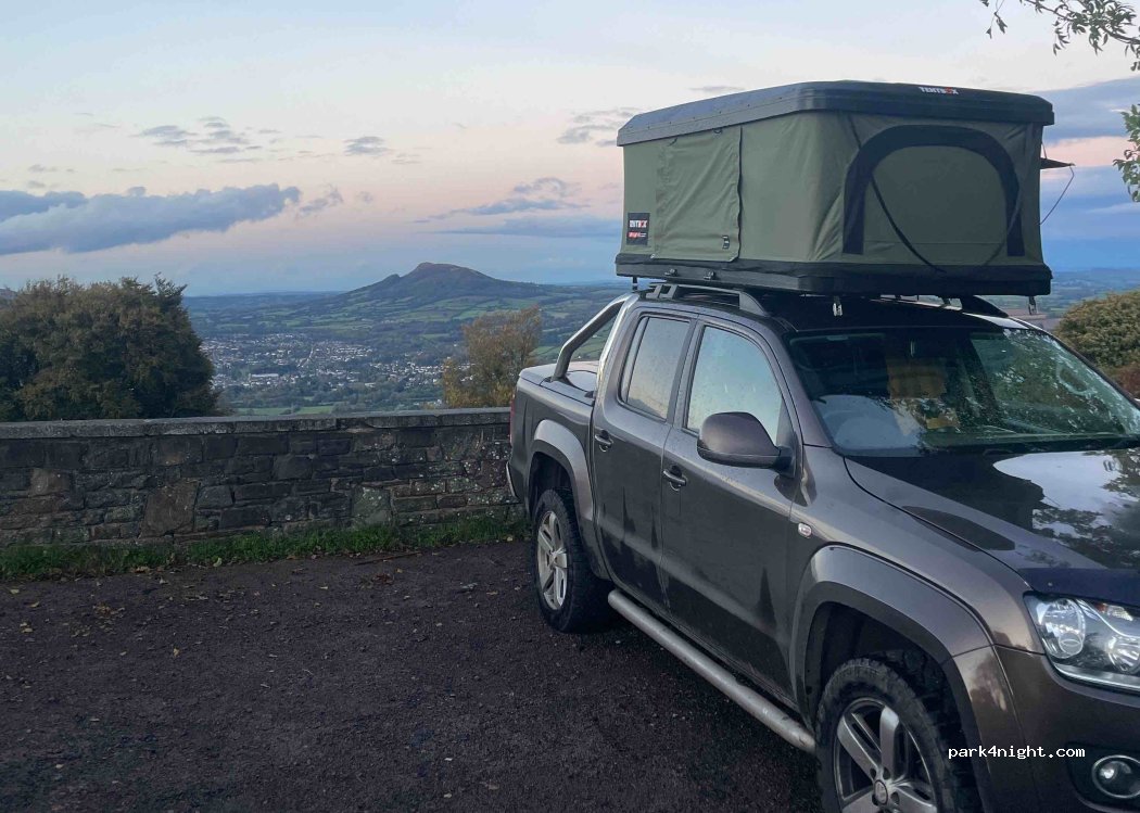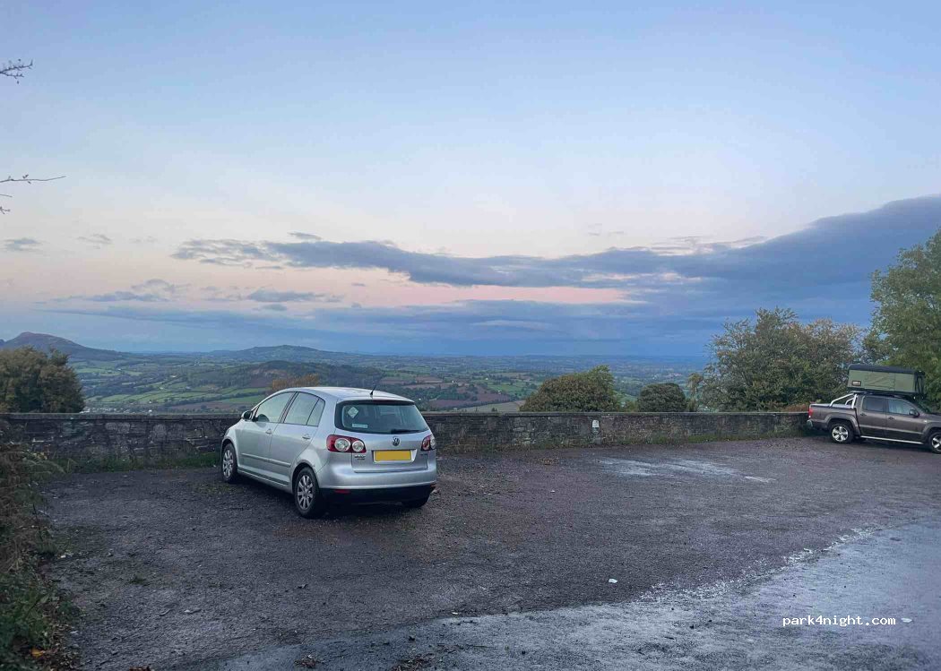 Perfect. A walled, level, gravelled parking area off a very quiet road with great views toward the Sugar Loaf mountain. Only a couple of cars parked for short periods of time and then left, had area to myself. Little road noise (from dual carriageway nr Abergavenny) and it’s dark enough to see the stars. Walls great for sitting or making breakfast on, some had had fires on grass/ car park area too