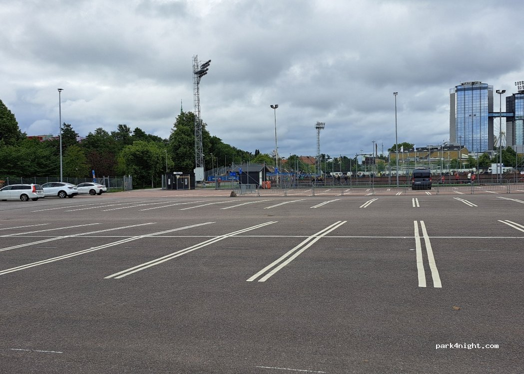 Parking right next to the stadium. Parkering Goteborg App required to pay. OK for one night if you are coming from the ferry. Great for day visits for large motorhomes at rear carpark, follow signs.