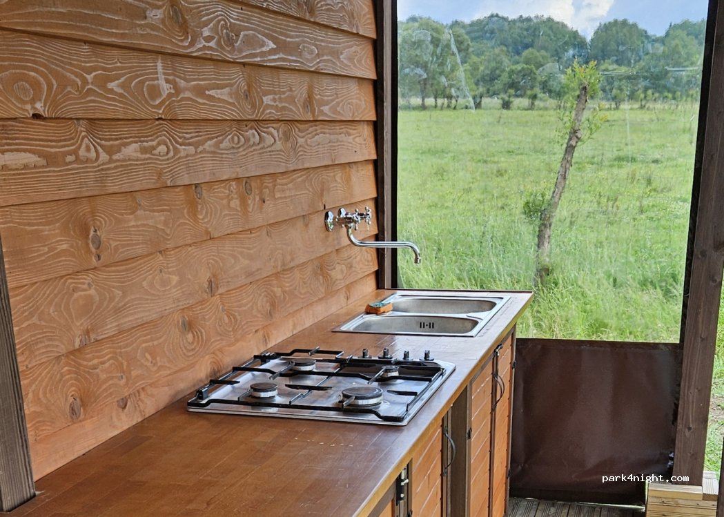 Camper park offers 10 parking spaces with access to electricity, service area from Camper System, summer sanitary facilities, outside kitchen.