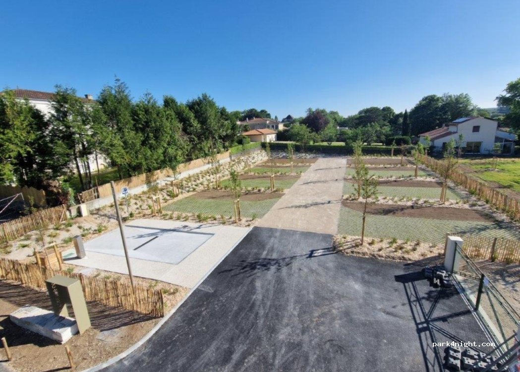 20 mins from Angouleme. Arrived on a wet rainy day but excellent hard base for parking, picnic bench and grassy area to sit in. Nice little town to walk around. Boulangerie nearby.