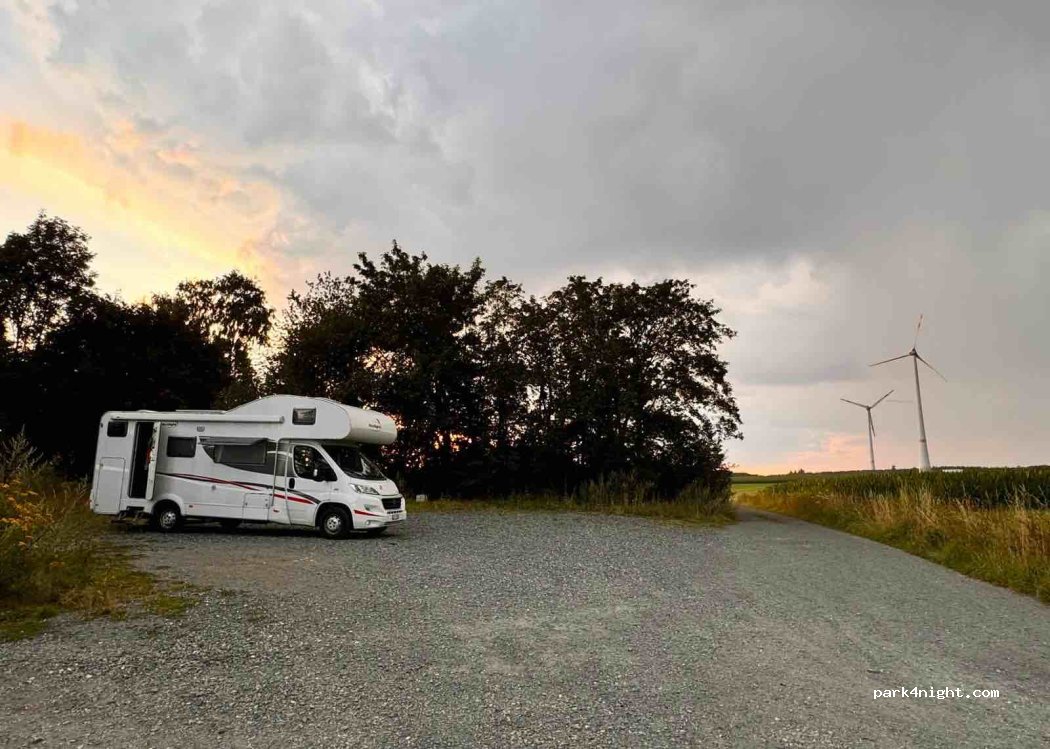 Nous avons passé une nuit tranquille ici en traversant l'Allemagne - à 10 minutes de détour de l'autoroute. Cela vaut la peine pour la vue sur le paysage et un peu de calme. Deux tables de pique-nique et un bac. Pas de panneau « interdiction de camping » et nous avons vu des gens promener leur chien le matin, sinon vide et personne ne semblait s'inquiéter de notre camping-car. La route d'accès légèrement étroite, mais avec une surface dure et peu raide, ne devrait pas poser de problème même dans un véhicule plus gros.