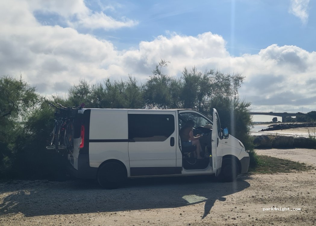 En van: très calme, pas de wc, vue sur le pont d’Oléron, passage de promeneur-euse-s et cyclistes jusqu’en soirée ensuite nuit très calme, nous n’avons pas pu nous baigner à cause de la marrée basse.