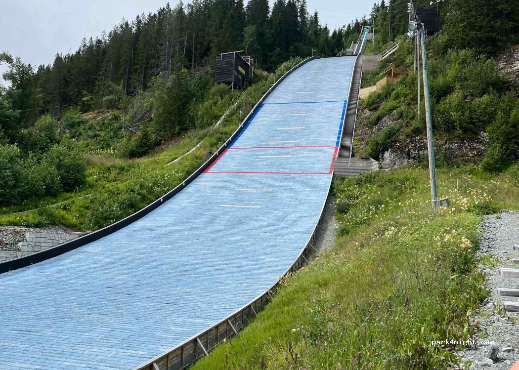 Ample parking next to a ski jump slope, short walk to the top of the ski jump, very quiet location in the countryside (parking not very flat)