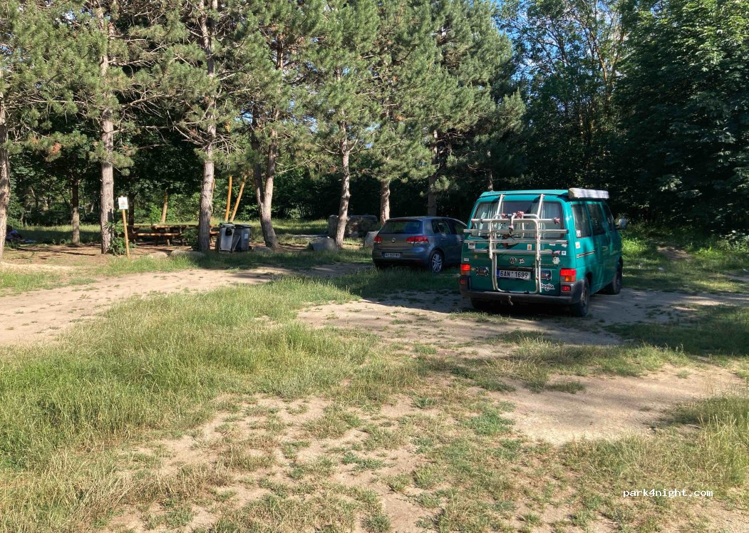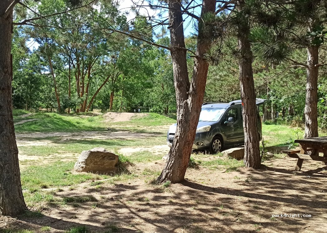 Bonito lugar de picnic para los lugareños al borde de un arroyo con una pequeña presa donde puedes sumergirte en el agua. BBQ, botes de basura, mesas de picnic. No dormimos aquí, pero creo que estaría totalmente bien. Hay una barrera de 2,2 m para acceder a la plaza de aparcamiento.