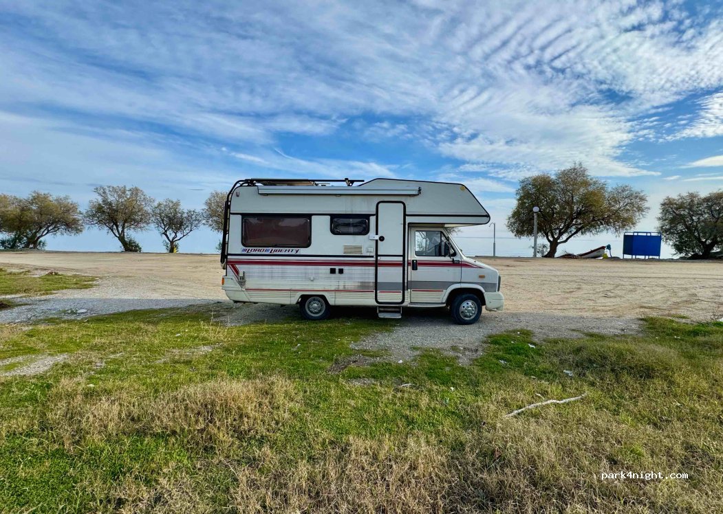 Nous avons passé 2 nuits ici. Des nombreux emplacements en bord de mer avec quelques arbres pour ne pas avoir le soleil dans le camion trop tôt le matin. De nombreux retraités viennent se baigner à partir de 08h, il est préférable de se mettre au début du parking pour être plus tranquille. La mer est superbe et calme le matin puis le vent se lève tous les jours en début d’après. Quand nous y étions de nombreux avions de l’armée faisaient des vas et viens depuis l’aéroport à proximité, il y avait donc un peu de bruit à partir de 09h mais rien de dérangeant pour nous.