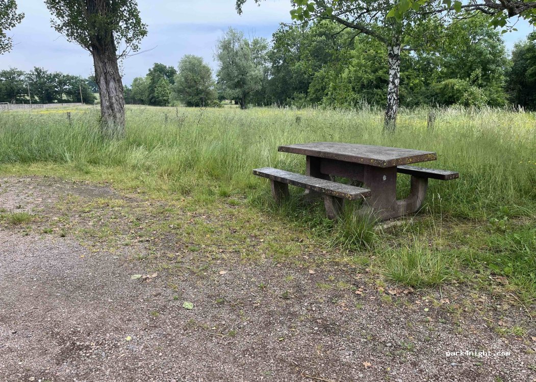 Parking in a corner of greenery with WC, picnic tables and garbage cans. Very pleasant for a meal break. Ideal with dog. Facing the meadow with horses. Possibility of spending the night but surely noise from the road... OK large motorhome (overcab 7.20 m) without problem.