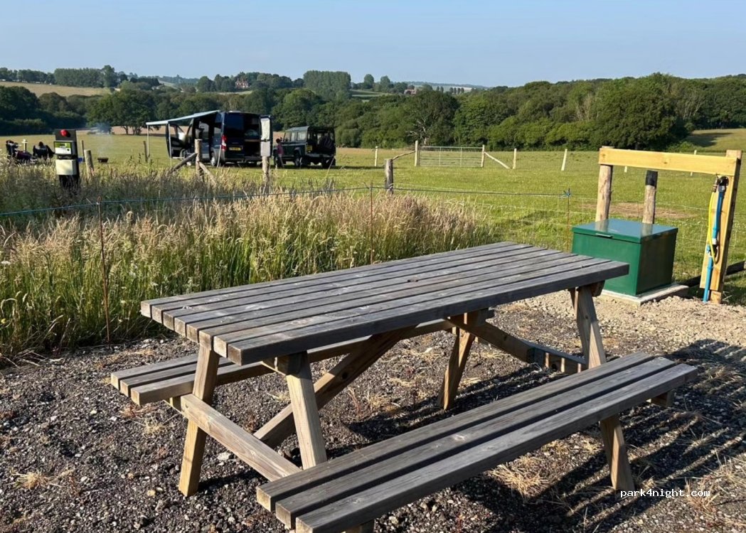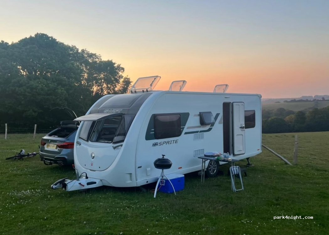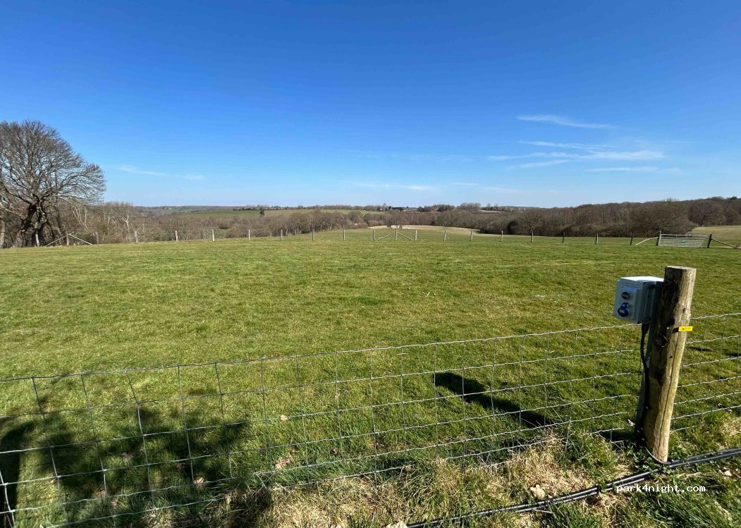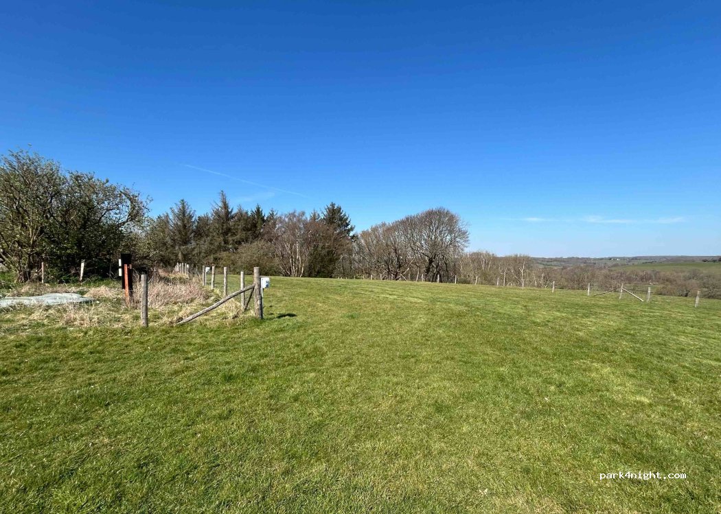 Une vue magnifique à 180° sur la campagne anglaise. Nous avons eu un emplacement après contact au téléphone, auprès de Éden. Toilette, eau, vidange eau noire. Attention,pas de produit chimique, cause fosse sceptique. Pas de douche . Électricité à la demande. 20£ pour un cc sans électricité et 25 avec. La simplicité et la quiétude à la campagne. Le +: allez boire un thé chez Violette,à côté.