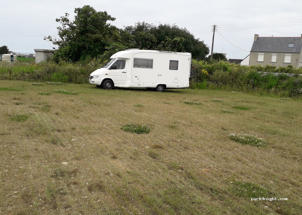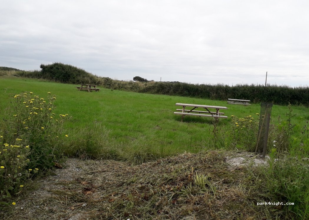 Une aire de camping-car dans un champ, avec un espace picnic à côté dans un autre champ (inaccessible aux véhicules) et des poubelles. Proche de la route, avec des haies basses ce qui nous rend visible des passants. Beaucoup de promeneurs avec des chiens qui jettent des regards suspicieux dès lors qu'on y reste hors périodes touristiques. A déconseiller par temps de pluie, risque de s'embourber.