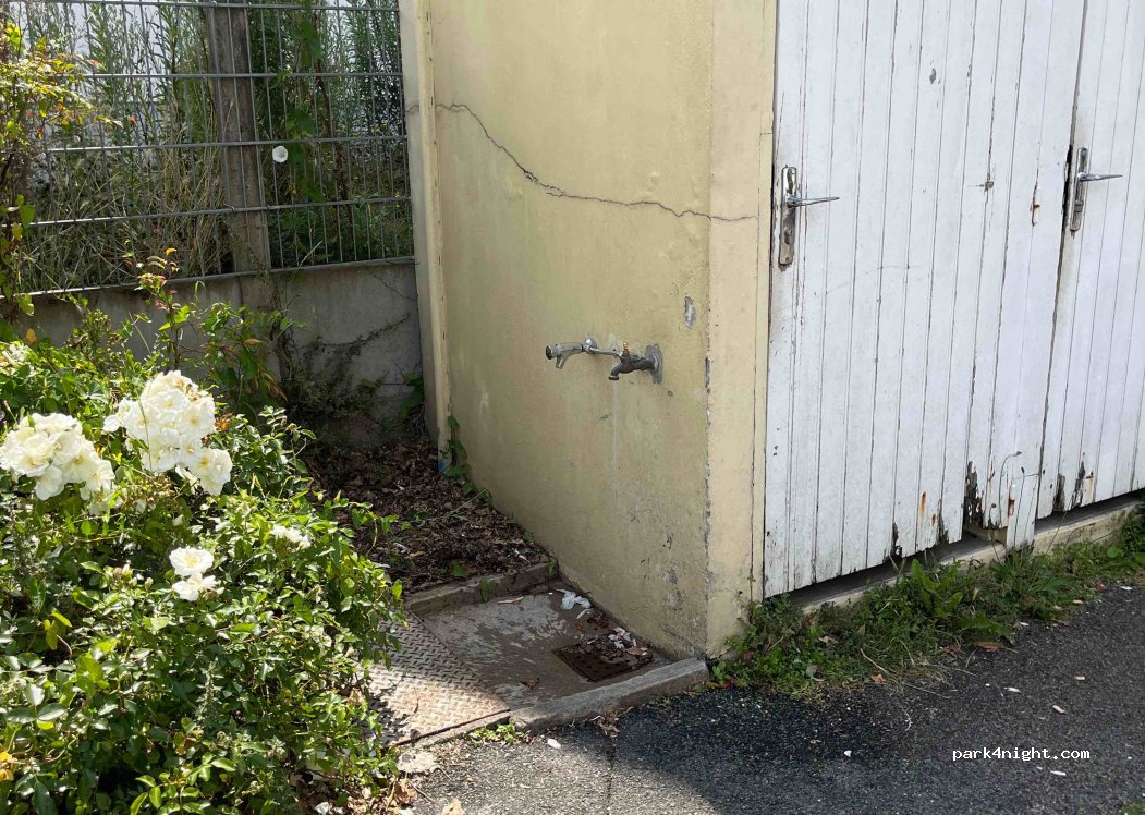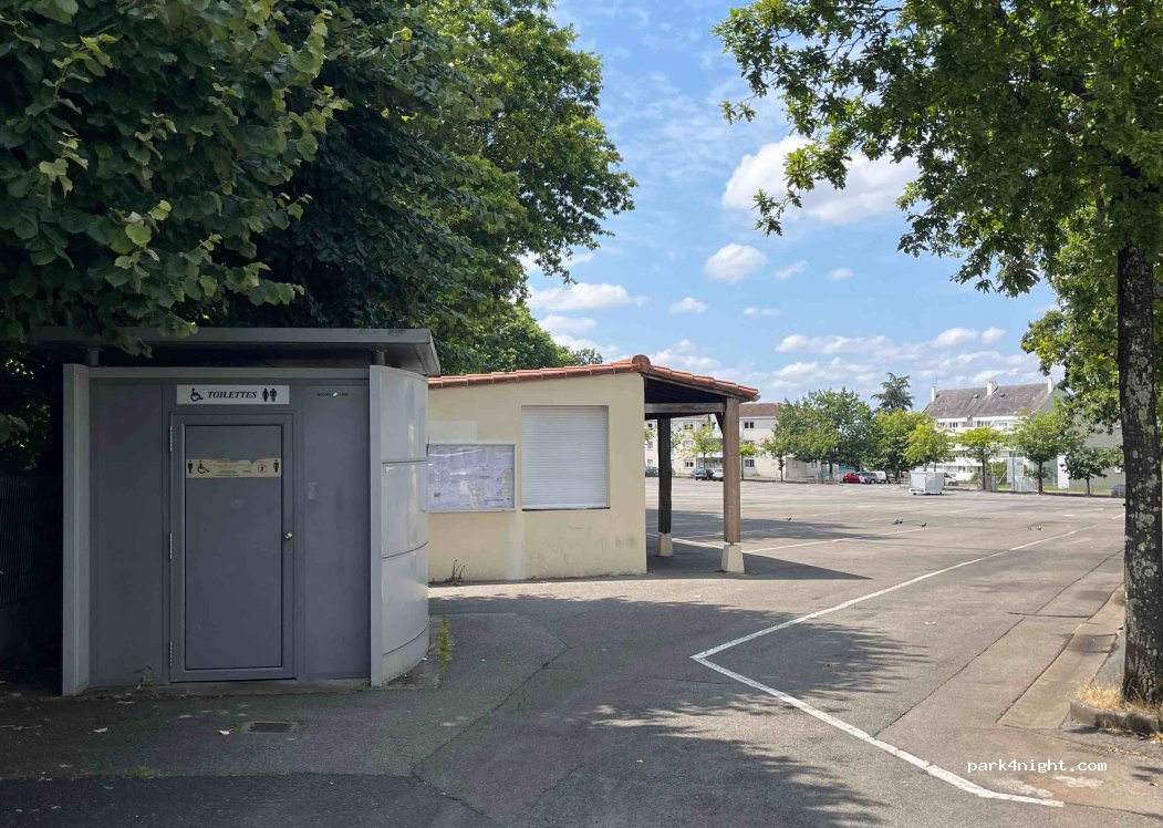 Petite fontaine à côté de toilettes publiques près d'une place où a lieu le marché, je pense le dimanche matin mais je ne suis pas sûr.