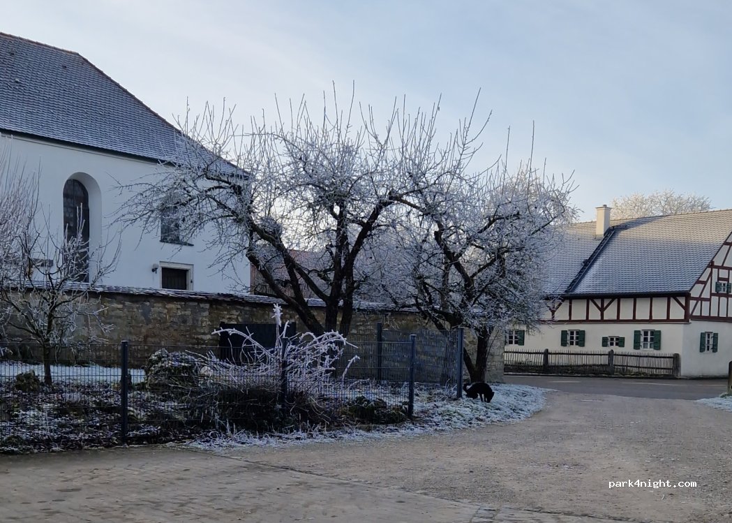 Place de parking à la ferme sur gravier/pelouse. Sur le Jurahöhe (Altmühltal), en bordure du village de Wiesenhofen. Juste à côté d'une plantation de légumes et de framboises. Douche et salle de lavage nouvellement construites. Couchers de soleil fantastiques, vues dégagées.