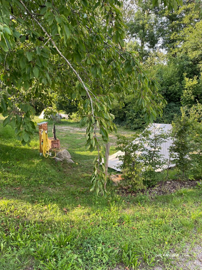 Der Stellplatz umgeben von Obstbäumen und einem Bach bietet unter anderem eine wunderbare Ausgangslage für den Fernwanderwerweg Albsteig