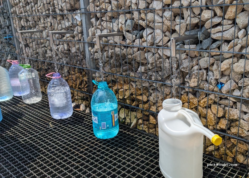 Drinking water from spring, 4 pipes coming out of caged stone wall outside a “premium” shop, excellent flow approx 20L/min each pipe. Lovely water, lots of locals filling up. No screw attachment for hose. Parking right next to fountain.
