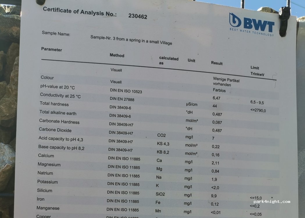 Wie bereits beschrieben tolle Wasserquelle, die auch überprüft wir. Die Laboranalyse werden ausgehängt. Die Quelle ist deshalb so stark frequentiert, das es sehr gutes Trinkwasser ist.