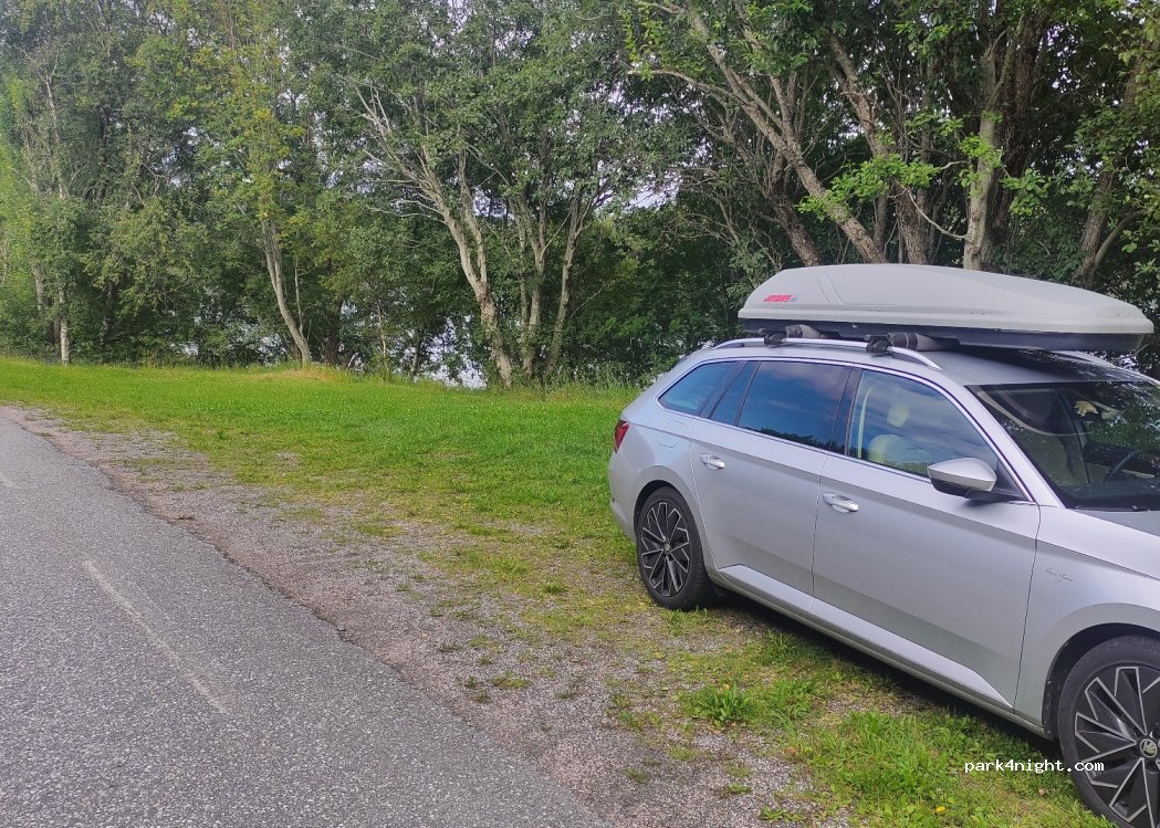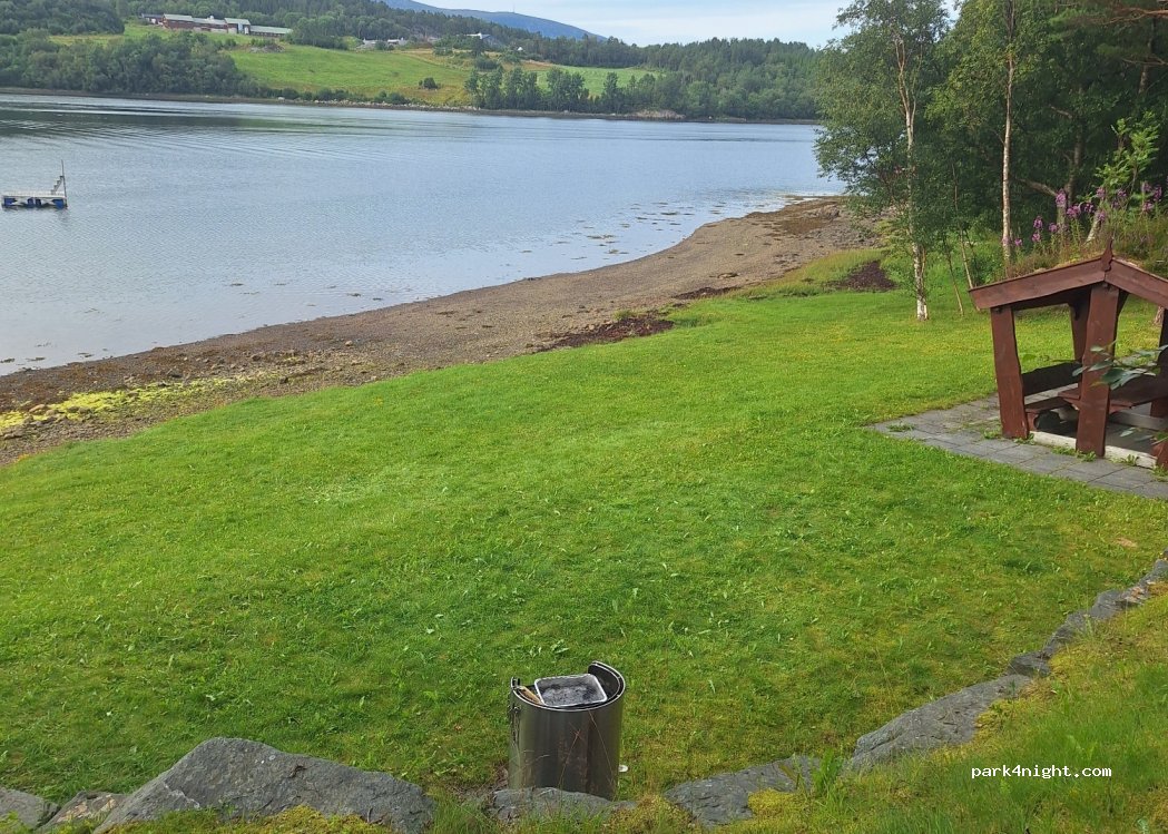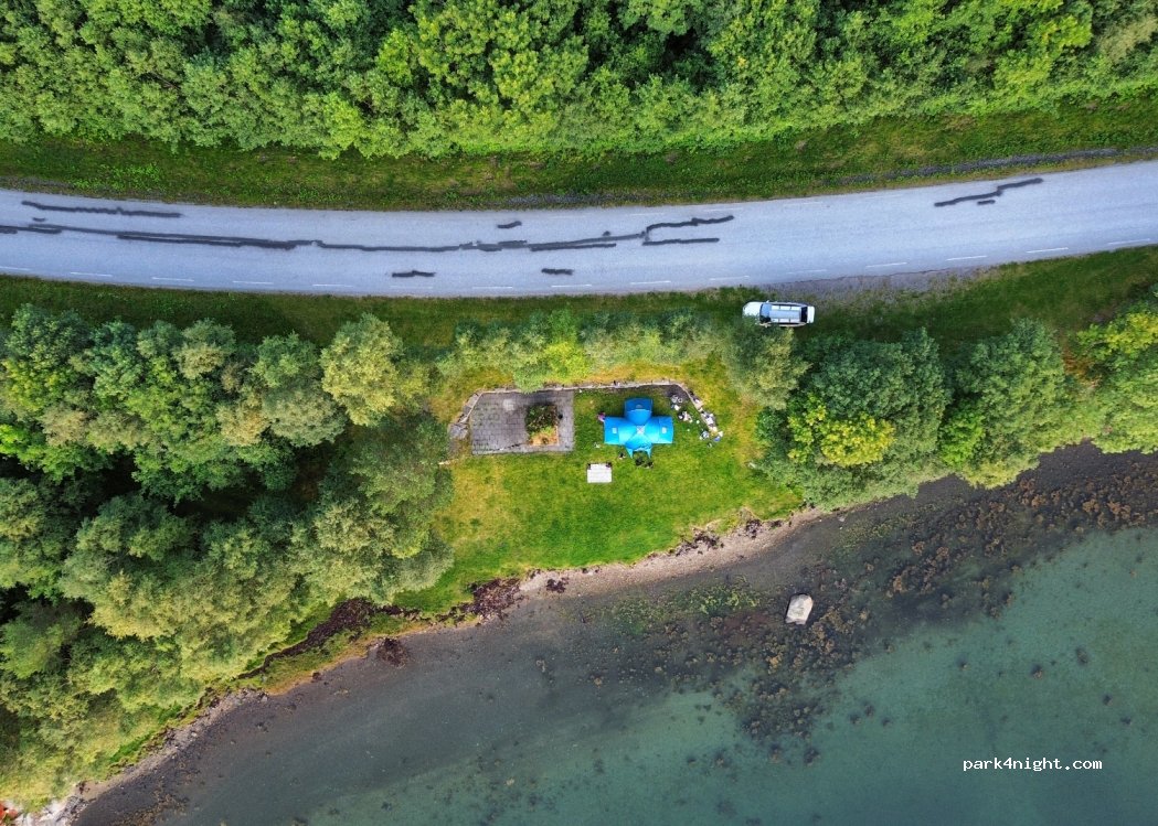 Parking et prairie droite idéale au bord du fjord. Il y a un grill et un banc couvert avec une table sur l'herbe. A proximité se trouve une jetée où vous pourrez pêcher dans le fjord, qui est assez peu profond. Il y a aussi un petit radeau dans lequel vous pouvez nager. Très belle vue et tranquillité car la rue à côté est peu passante. Très beau coucher de soleil ? Le seul inconvénient est le manque de toilettes et le fait qu’il n’y a pas d’eau douce à proximité.