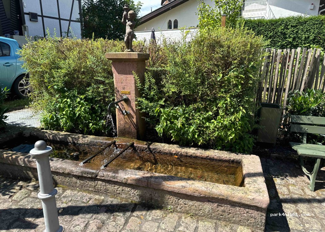 Trinkwasserbrunnen mit Platz zum Nachfüllen und Gewindehahn zum Anschließen eines Schlauchs.