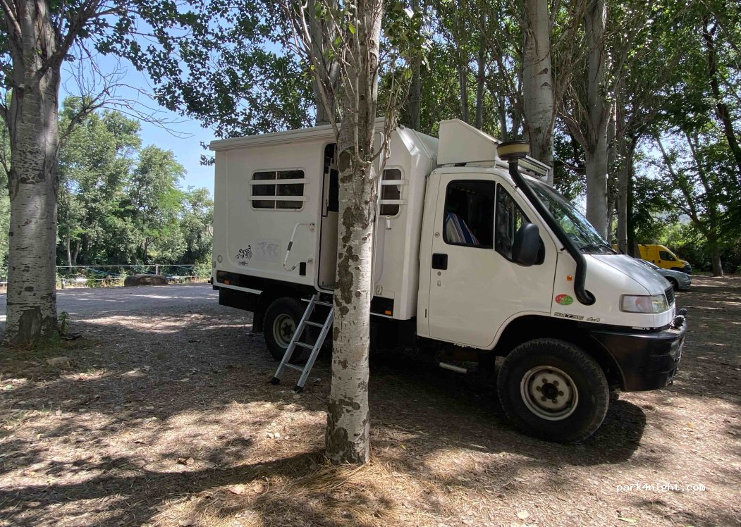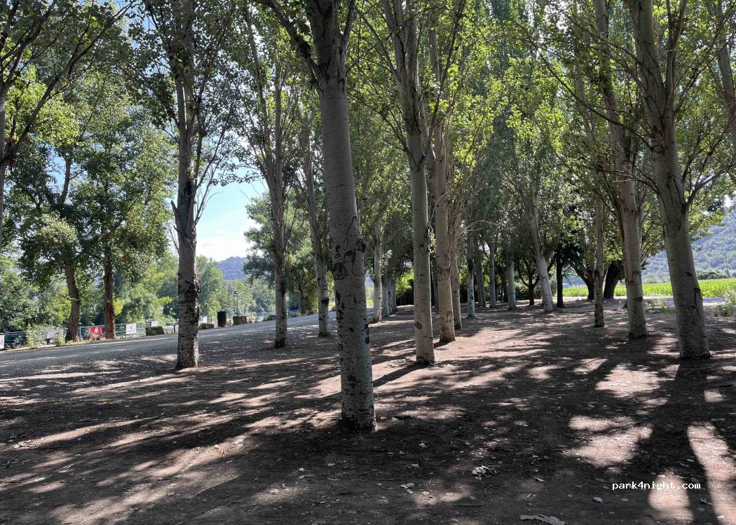 Schöner Parkplatz am Eingang des Gemeinschaftsparks, asphaltierte Plätze oder auf der Wiese zwischen den Platanen (im Schatten). Im Park kostenlos verfügbar: Kinderspielplatz, Picknicktische, sehr saubere Toiletten, am Flussufer, das mit einer Kajakstrecke ausgestattet ist (nautischer Stützpunkt neben dem Stadtpark). Wir machten hier Mittagspause, aber kein Verbot beim Übernachten. Wunderschöne Gegend.