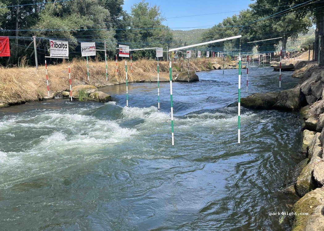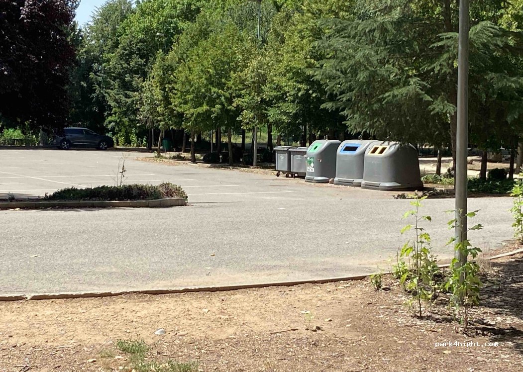 Bonito aparcamiento a la entrada del Parque Comunitario, espacios asfaltados o de césped entre los plátanos (a la sombra). Disponible de forma gratuita en el parque: zona de juegos para niños, mesas de picnic, baños muy limpios, al borde del río que está equipado con un recorrido de kayak (base náutica contigua al parque municipal) Aquí tomamos nuestro descanso para almorzar, pero no hay prohibición. en pasar la noche. Hermosa zona.