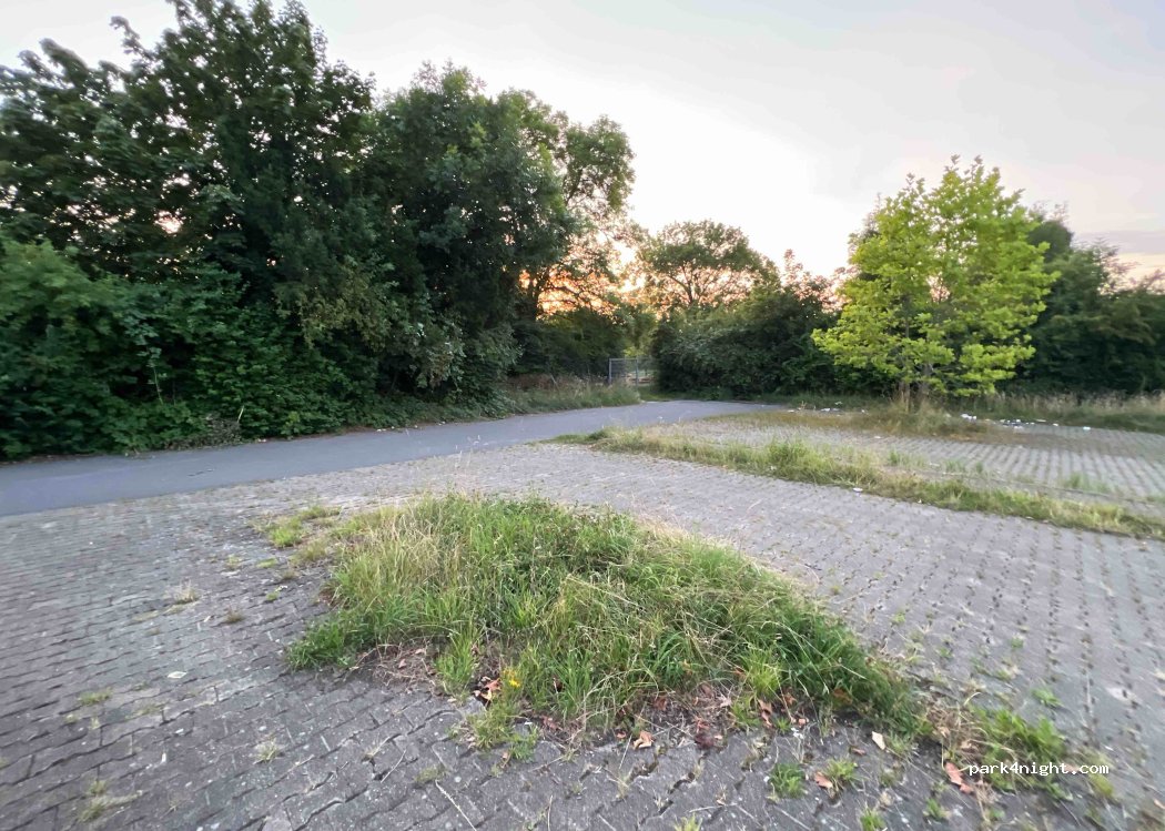 Parking lot of the no longer existing local swimming pool. No infrastructure, you can hear the road in the background, but it's fine for passing through. No winter maintenance, which is why the city has half-heartedly closed off the parking lot from January to the end of March in the past, without any signage.