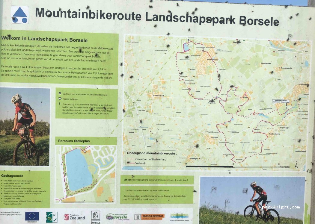 Vertrekparkeerplaats voor wandeltochten van 1 km, 3,5 km en 4,5 km en fietstochten van 13 km en 30 km. Enkele autogeluiden van de aangrenzende weg. Zelfbedieningsfietsreparatieset (pomp, tang, schroevendraaier, sleutels, enz.)