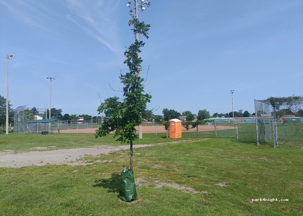 Großer Parkplatz hinter der öffentlichen Bibliothek, abseits der Straße.