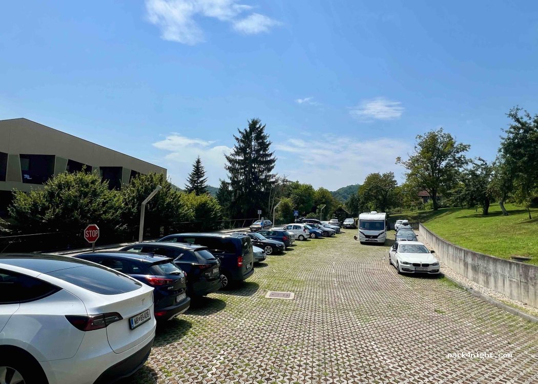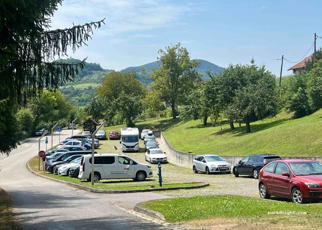 Parking close to the Tuhelj thermal baths and next to the bicycle path „Toplička ruta” . The hilly area is lined with apple orchards and wineries. You can hear street noises but there is little traffic.