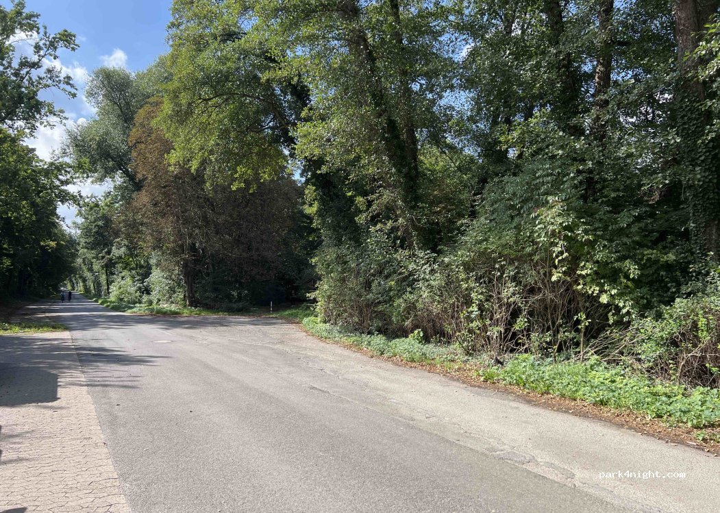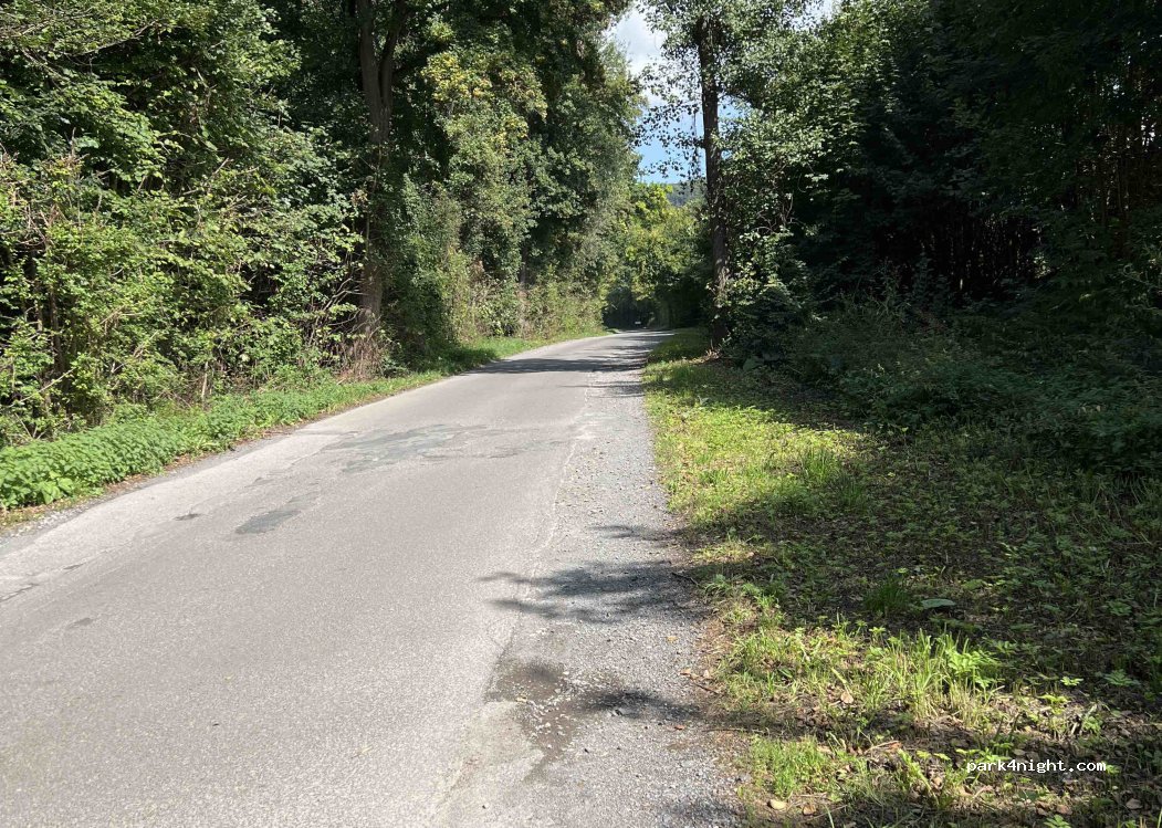 Parkplatz ist nicht ganz so sauber, aber genügend Platz, direkt an den Bahngleisen. Auf der Straße relativ viel Verkehr, viele Radfahrer. Aber man kann wunderbar spazieren gehen im gegenüberliegenden Wald. Für eine Nacht geht's.
