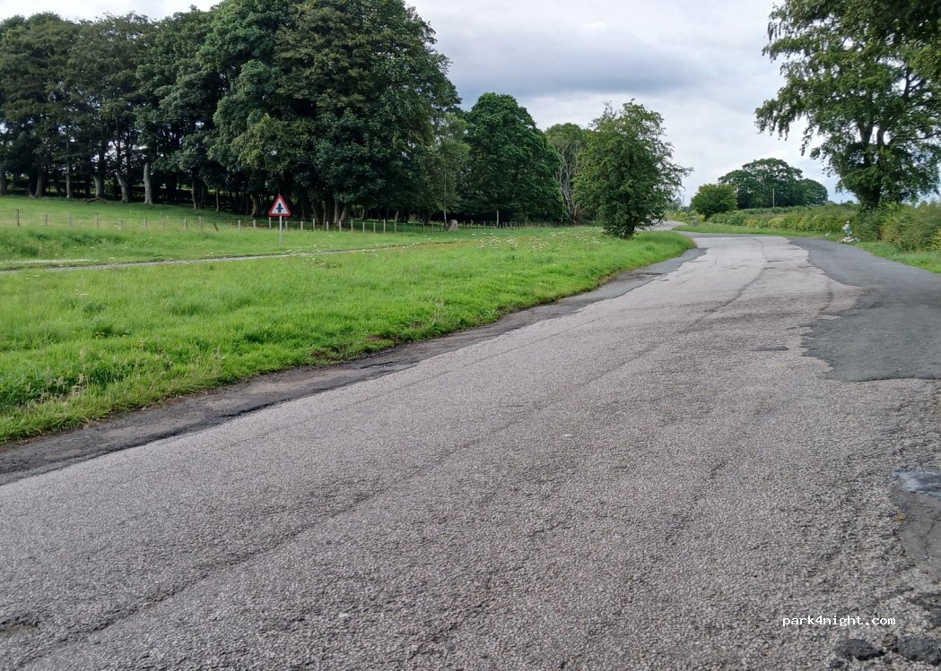 Großer Parkplatz abseits der Hauptstraße A701. Platz für vielleicht 10 Wohnmobile. Sehr beliebt bei LKWs. Keine Beschränkungen, Dienstleistungen oder Mülltonnen. Umgeben von Feldern und Bergen. Schlechtes 4G-Signal (3).