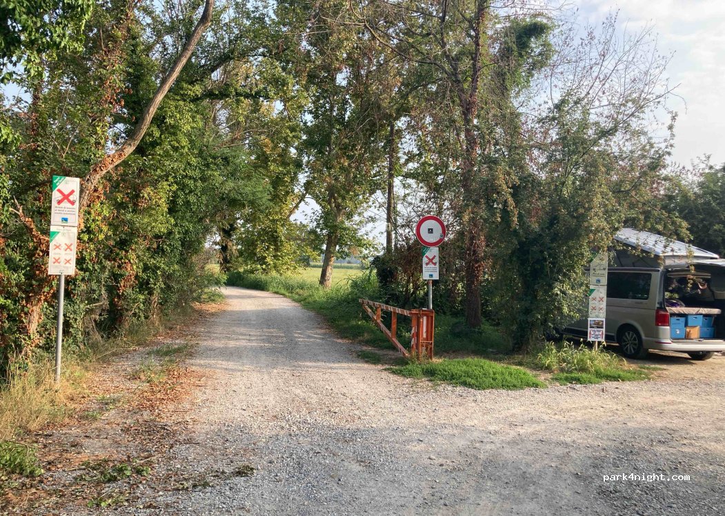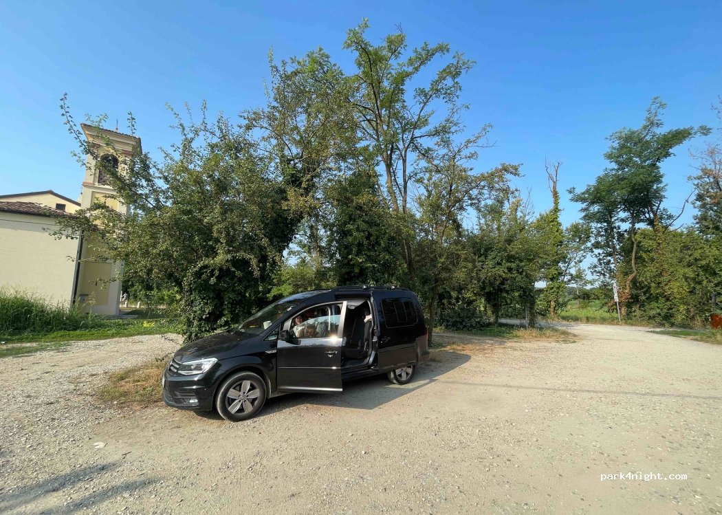 Idyllic little farm with many different animals (ponies, dogs, cats, chickens, rabbits, bees, insects of all kinds...) and a very nice host who speaks German and Englisch, has lots of good tips for the area and his mom, who likes to speak in Italian and bring apricots or blackberries. There is a mini pool to cool off in and you can rend bikes and rickshaw. The bathroom is very modern and clean. By the nearby river there is a nice beer garden with delicious foccacia. There are various small specialties to buy, such as eggs, honey, jam, wine, vinegar and olive oil. A trip to Mantua is recommended and it is half an hour from Lake Garda or Verona.You park in the field, little shade for the summer, sometimes music coming from the restaurant on the river.