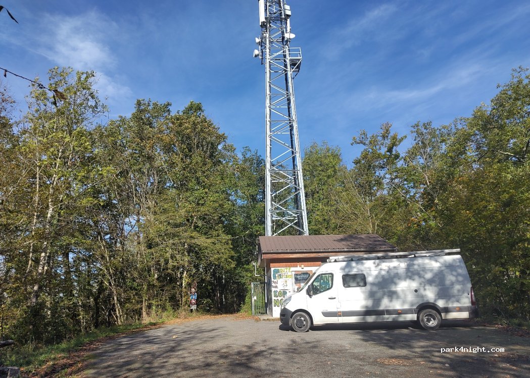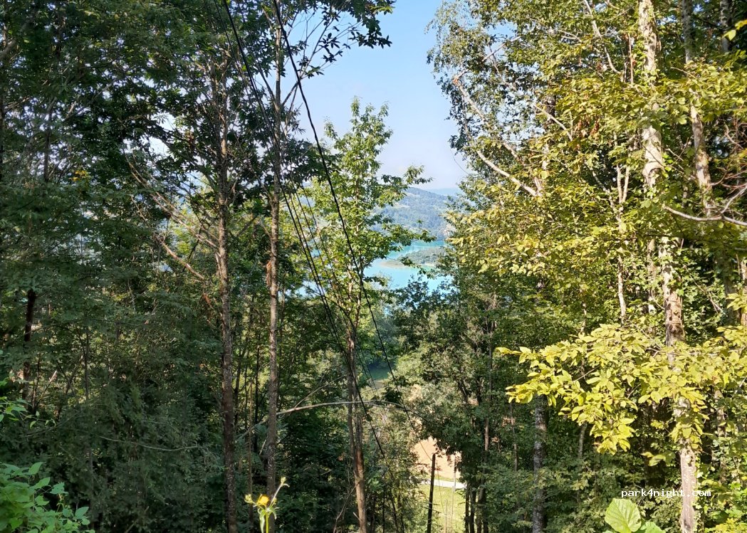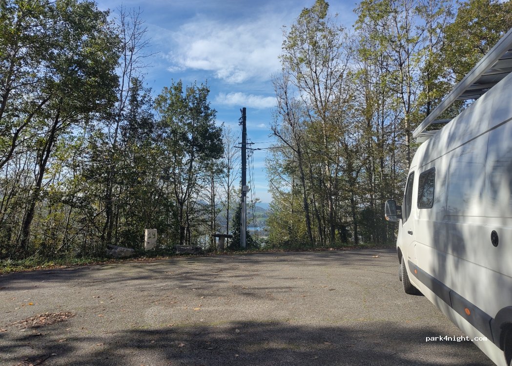 Une petite vue discrète sur le lac, un cul de sac dans une rue de montagne/forêt. Un bruit en effet present mais on s'est mis au plus loin. Sympa pour les chiens. Un deuxième van s'est rajouté par après.