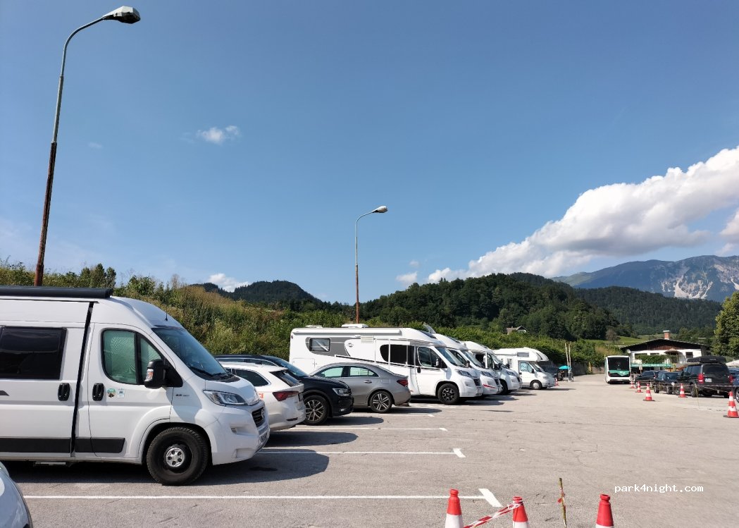 Park and Ride muy práctico para Vintgar (este es el parking P1). Aparcan también coches pero autocaravanas y furgonetas tienen un espacio reservado, entre 10-15 plazas, está organizado. Precio fijo 5 euros y bus lanzadera gratis cada 20 minutos, también para volver después de la visita.
