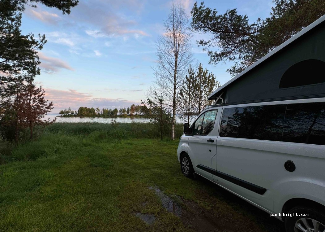 Schöner Platz für eine Nacht. Flacher Zugang zum See. Kleines Plumpsklo etwas zurückversetzt im Wald. Max. 4-5 Camper möglich, dann steht man aber auch Tür an Tür. Freitag Abend: viel los - 5 Camper und viele Einheimische bei deren Hütten. Einsam stehen tut man hier nicht :)