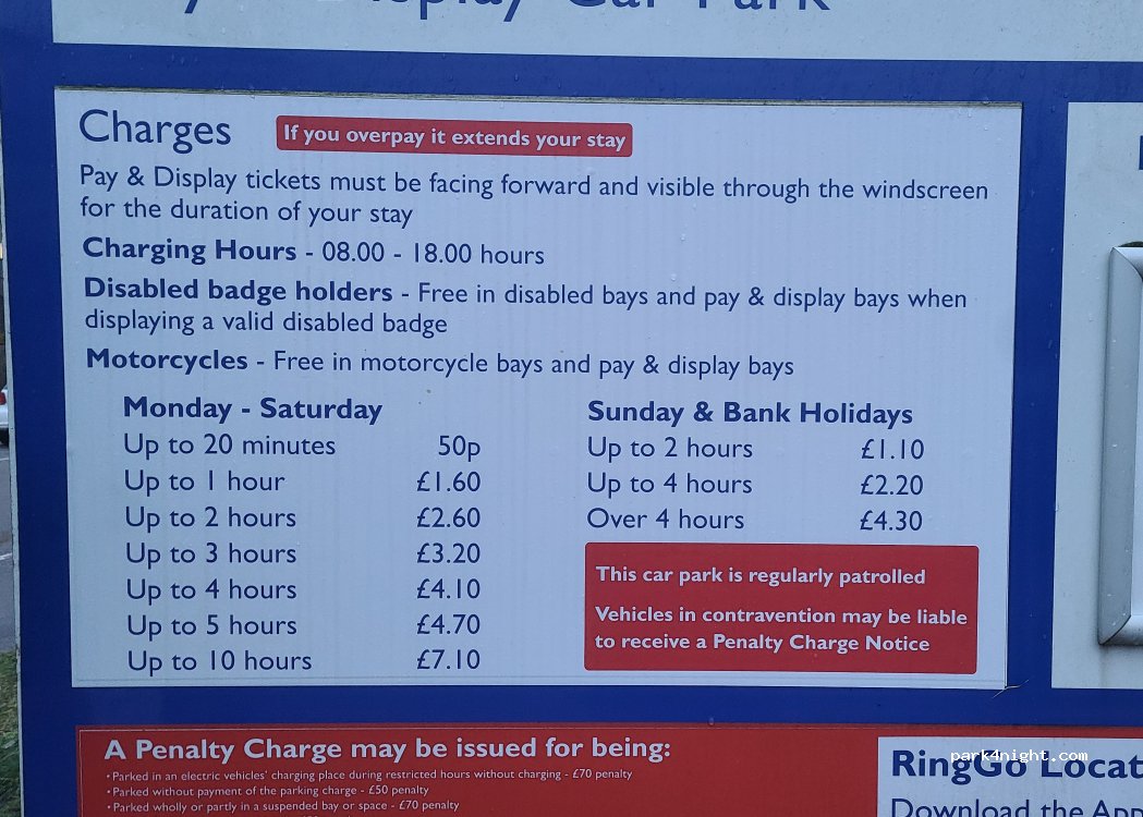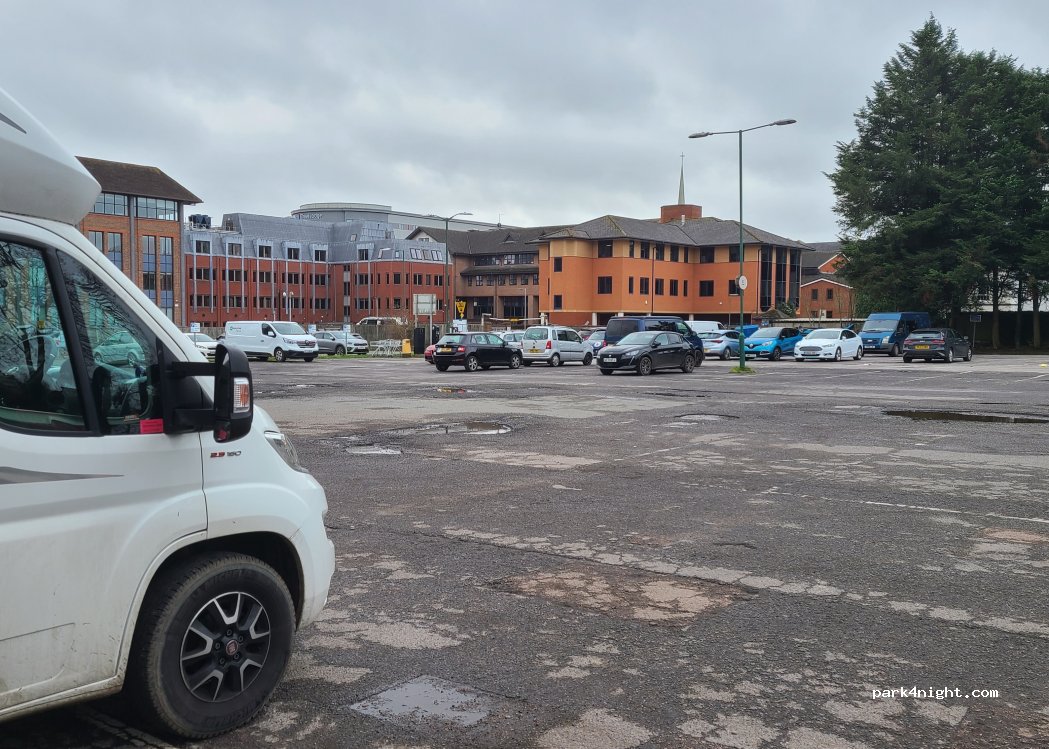 Large pay car park, no height restrictions, on the flat except for a fair few potholes. Close to the town centre, felt safe. Quite a few learner drivers practicing their parking skills.