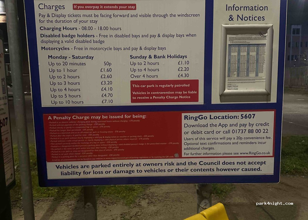 Really good P4N. Huge car park for over 100 cars, Lorry’s and camper vans. Very safe. When we were there on 1/5/25 there were 12 Artic lorrys and 4 other camper vans. Huge supermarket is 1 minute walk away, town centre pubs and bars are 2 minutes walk away. No showers or toilets because after all, this is a car park. Thanks Redhill Council.